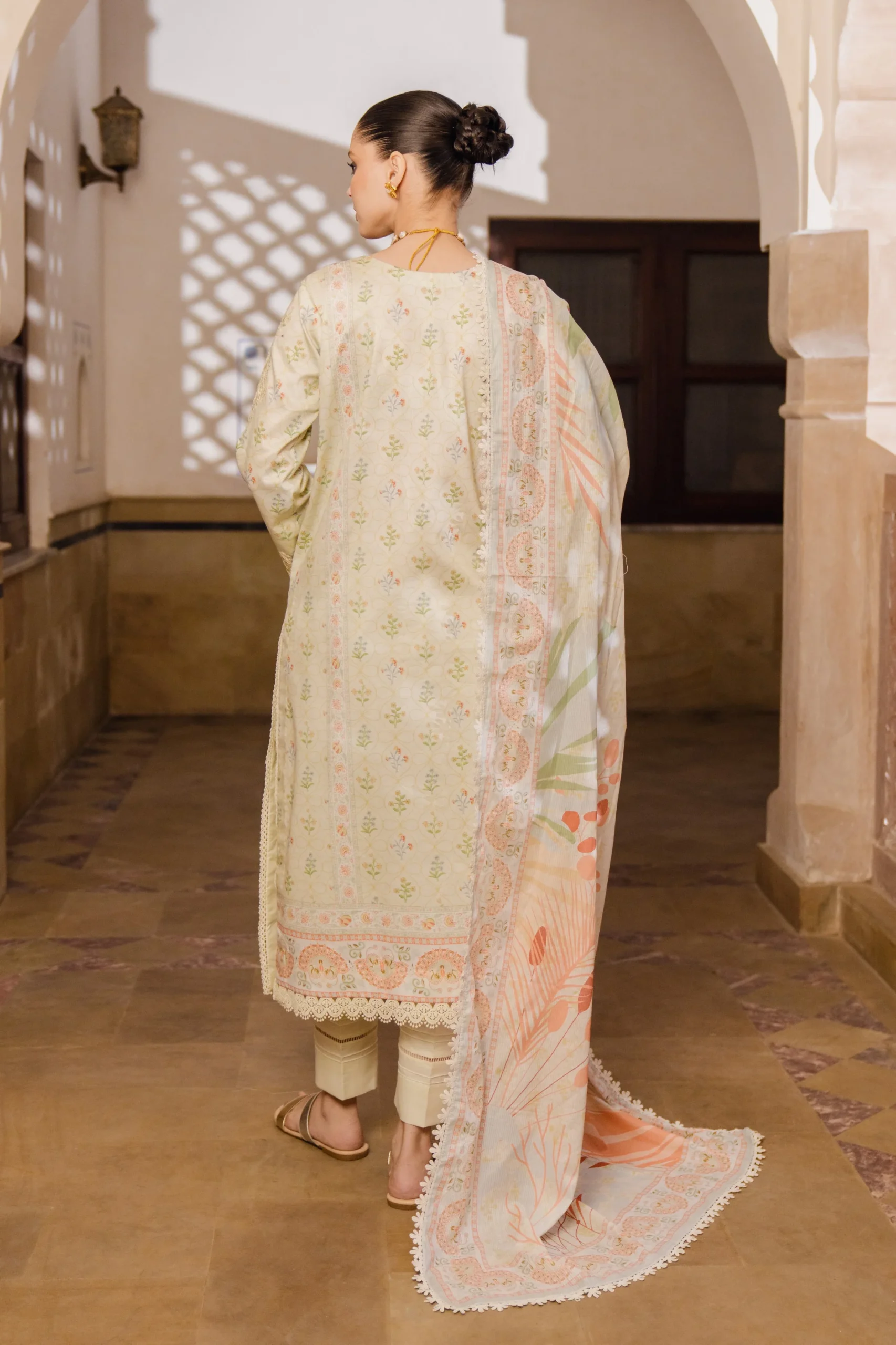 Printed lawn front and back, paired with a lace-detailed dupatta and dyed trouser. Elevate your style with embroidered neck patch, sleeves border, and daman border, adorned with charming sleeves motifs. Unveil the artistry of tradition in every stitch. Exquisite elegance meets intricate craftsmanship in this Chikankari embroidered ensemble.
